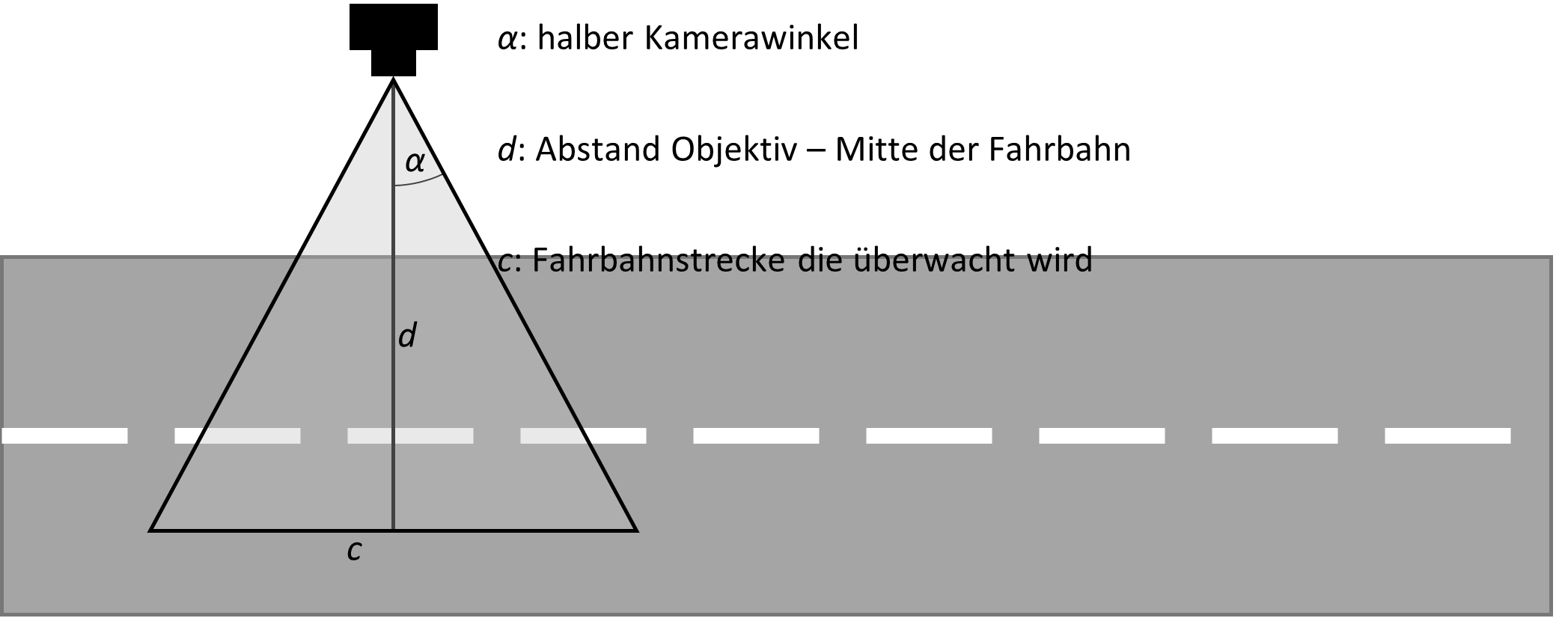 Eine Kamera ist hinter einer Fensterscheibe senkrecht zur Fahrbahn gerichtet fest positioniert. Über den bekannten Kamerawinkel und der Entfernung zur Fahrbahn kann über wenige Formeln ermittelt werden wieviel Meter Länge der Straße von der Kamera abgedeckt werden.